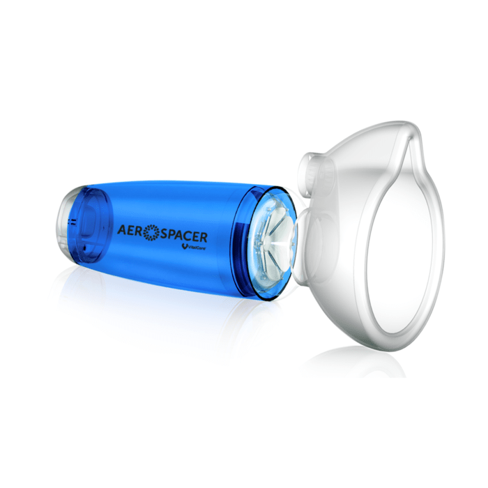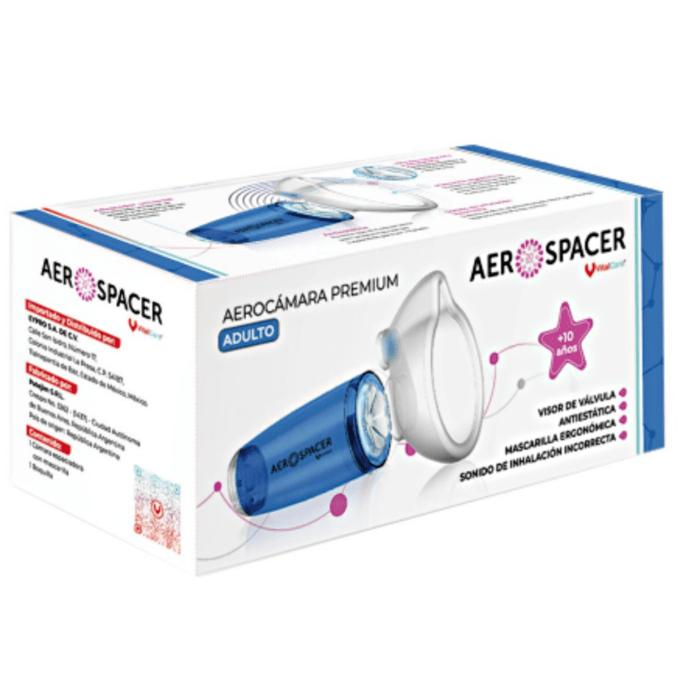 Aerocámara Premium Aerospacer diseñada para la administración óptima de medicamentos en IDM (Inhalador de dosis medida) con entrada universal que se adapta a la mayoría de los medicamentos.