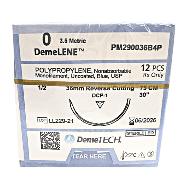 Sutura quirúrgica de polipropileno inerte, no absorbible, estéril, compuesta por un estereoisómero cristalino isostático de polipropileno, una poliolefina lineal sintética, la sutura esta pigmentada para mejorar su visibilidad. Esterilizada por óxido de etileno. Con o sin aguja de acero inoxidable 420SS (ASTM A 176).